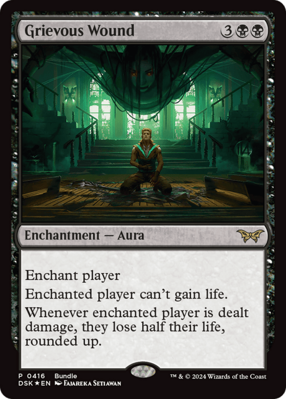 Enchant player Enchanted player can't gain life. Whenever enchanted player is dealt damage, they lose half their life, rounded up.