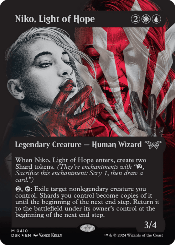 When Niko enters, create two Shard tokens. (They're enchantments with "{2}, Sacrifice this token: Scry 1, then draw a card.") {2}, {T}: Exile target nonlegendary creature you control. Shards you control become copies of it until the next end step. Return it to the battlefield under its owner's control at the beginning of the next end step.