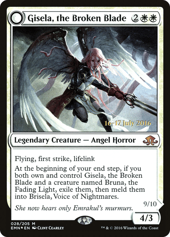 Flying, first strike, lifelink At the beginning of your end step, if you both own and control Gisela and a creature named Bruna, the Fading Light, exile them, then meld them into Brisela, Voice of Nightmares.