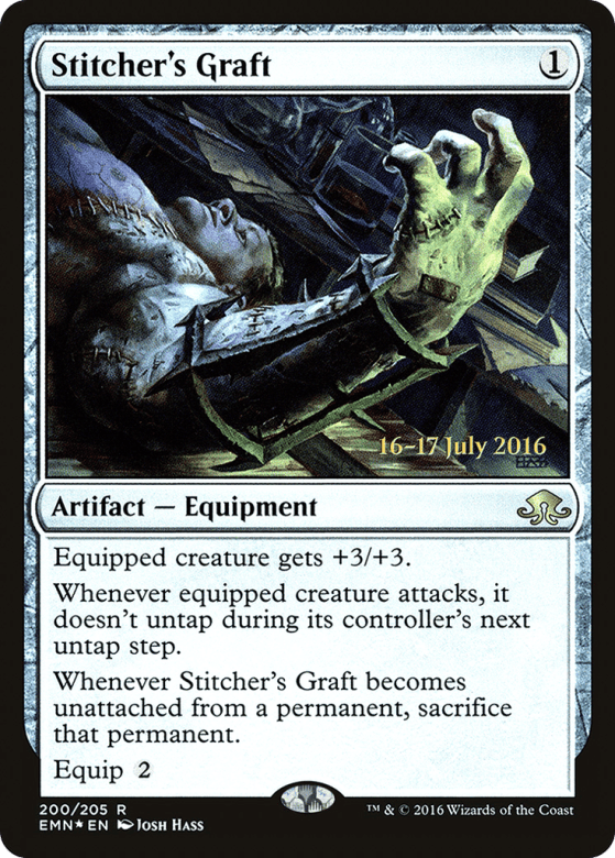 Equipped creature gets +3/+3. Whenever equipped creature attacks, it doesn't untap during its controller's next untap step. Whenever this Equipment becomes unattached from a permanent, sacrifice that permanent. Equip {2}