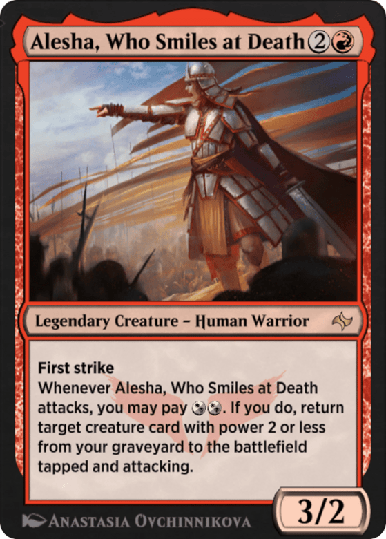 First strike Whenever Alesha attacks, you may pay {W/B}{W/B}. If you do, return target creature card with power 2 or less from your graveyard to the battlefield tapped and attacking.