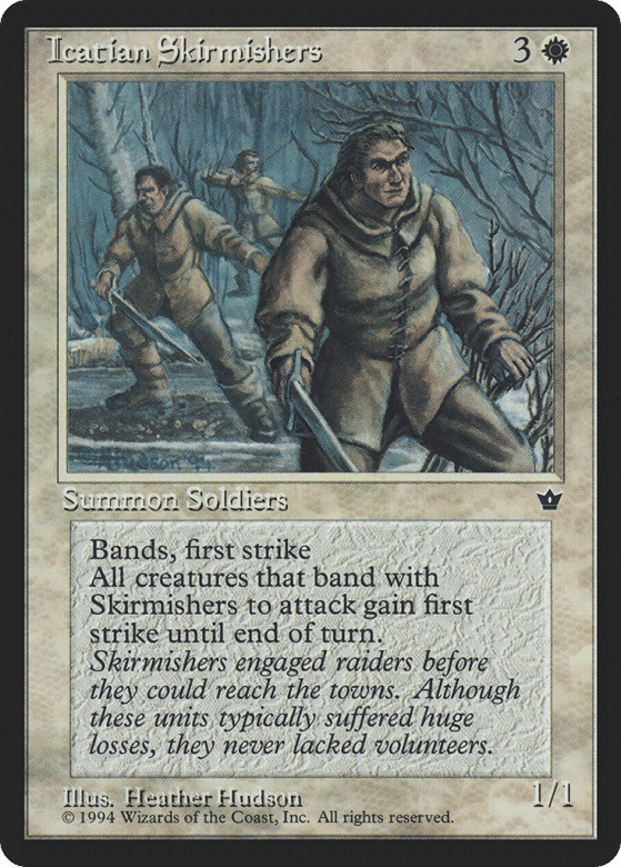 First strike; banding (Any creatures with banding, and up to one without, can attack in a band. Bands are blocked as a group. If any creatures with banding you control are blocking or being blocked by a creature, you divide that creature's combat damage, not its controller, among any of the creatures it's being blocked by or is blocking.) Whenever this creature attacks, all creatures banded with it gain first strike until end of turn.
