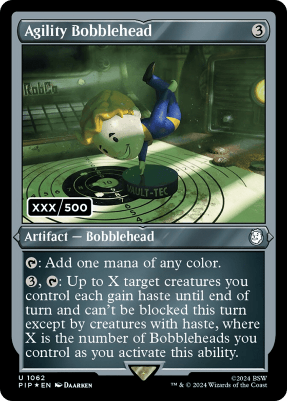 {T}: Add one mana of any color. {3}, {T}: Up to X target creatures you control each gain haste until end of turn and can't be blocked this turn except by creatures with haste, where X is the number of Bobbleheads you control as you activate this ability.