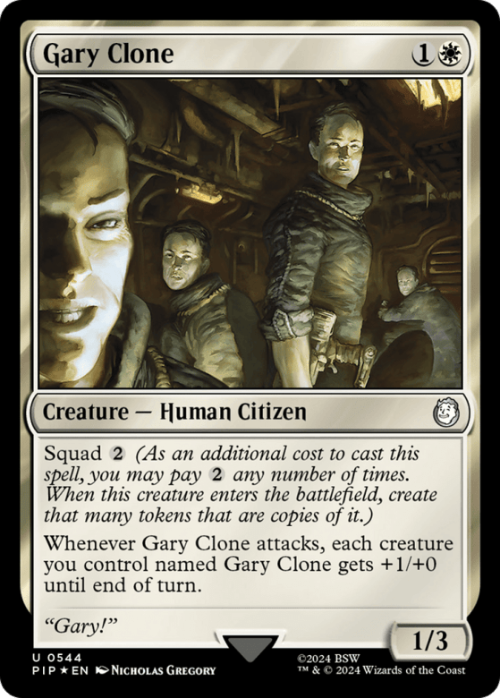 Squad {2} (As an additional cost to cast this spell, you may pay {2} any number of times. When this creature enters, create that many tokens that are copies of it.) Whenever this creature attacks, each creature you control named Gary Clone gets +1/+0 until end of turn.