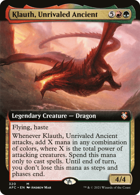 Flying, haste Whenever Klauth attacks, add X mana in any combination of colors, where X is the total power of attacking creatures. Spend this mana only to cast spells. Until end of turn, you don't lose this mana as steps and phases end.