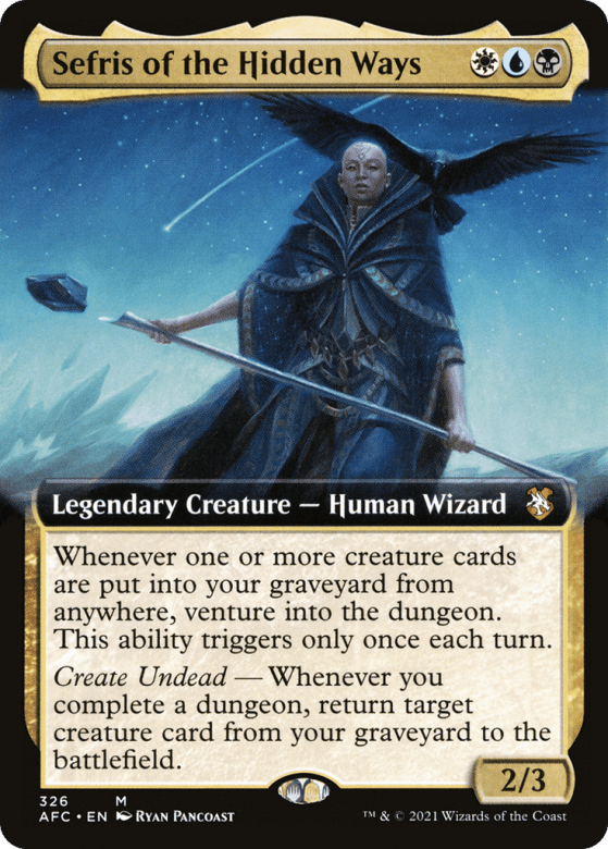 Whenever one or more creature cards are put into your graveyard from anywhere, venture into the dungeon. This ability triggers only once each turn. (To venture into the dungeon, enter the first room or advance to the next room.) Create Undead — Whenever you complete a dungeon, return target creature card from your graveyard to the battlefield.