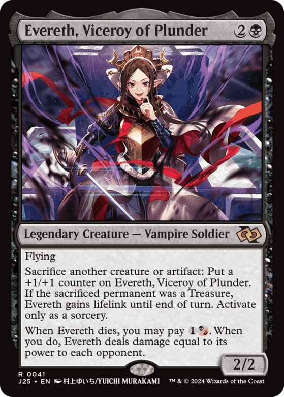 Flying Sacrifice another creature or artifact: Put a +1/+1 counter on Evereth. If the sacrificed permanent was a Treasure, Evereth gains lifelink until end of turn. Activate only as a sorcery. When Evereth dies, you may pay {1}{B/R}. When you do, Evereth deals damage equal to its power to each opponent.