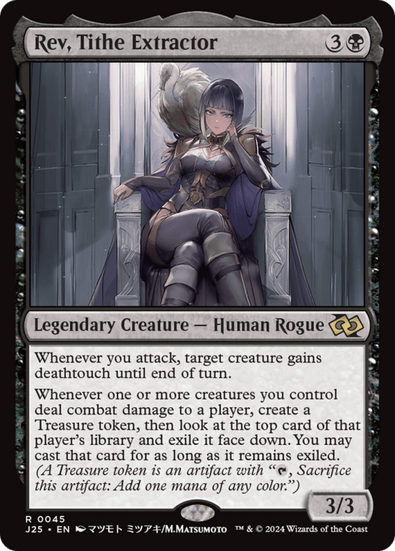 Whenever you attack, target creature gains deathtouch until end of turn. Whenever one or more creatures you control deal combat damage to a player, create a Treasure token, then look at the top card of that player's library and exile it face down. You may cast that card for as long as it remains exiled. (A Treasure token is an artifact with "{T}, Sacrifice this token: Add one mana of any color.")