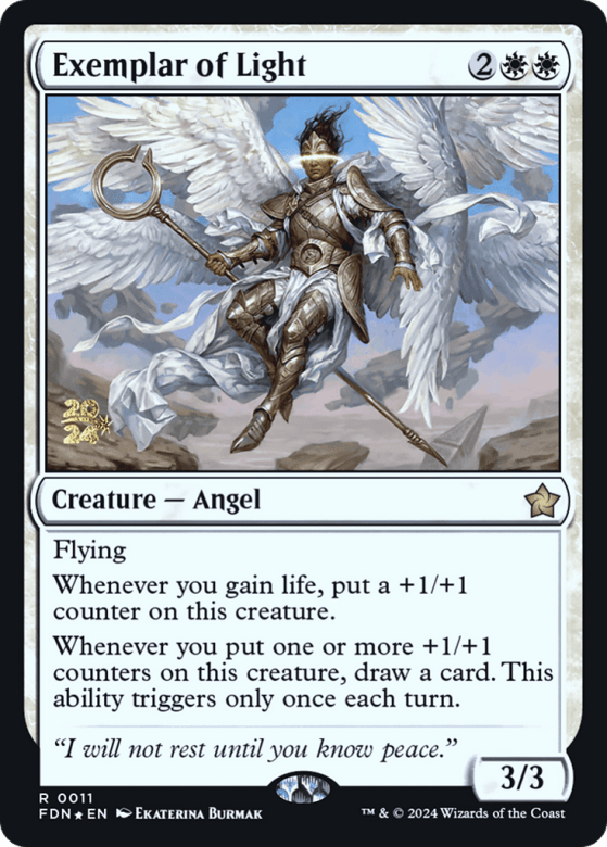 Flying Whenever you gain life, put a +1/+1 counter on this creature. Whenever you put one or more +1/+1 counters on this creature, draw a card. This ability triggers only once each turn.
