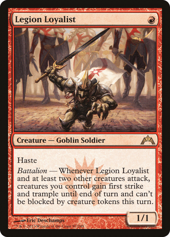 Haste Battalion — Whenever this creature and at least two other creatures attack, creatures you control gain first strike and trample until end of turn and can't be blocked by creature tokens this turn.
