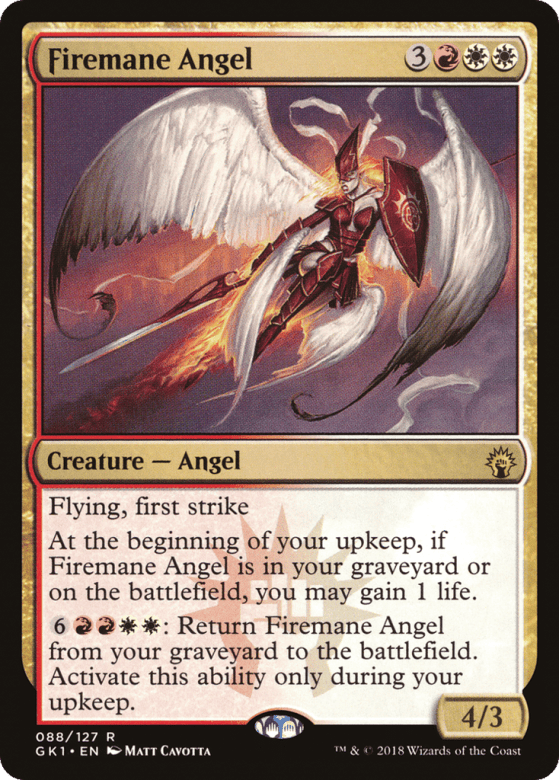Flying, first strike At the beginning of your upkeep, if Firemane Angel is in your graveyard or on the battlefield, you may gain 1 life. {6}{R}{R}{W}{W}: Return this card from your graveyard to the battlefield. Activate only during your upkeep.