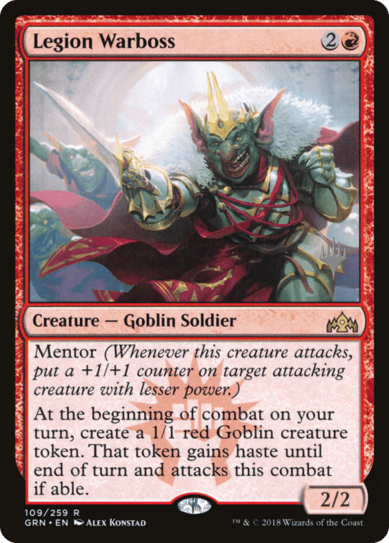 Mentor (Whenever this creature attacks, put a +1/+1 counter on target attacking creature with lesser power.) At the beginning of combat on your turn, create a 1/1 red Goblin creature token. That token gains haste until end of turn and attacks this combat if able.