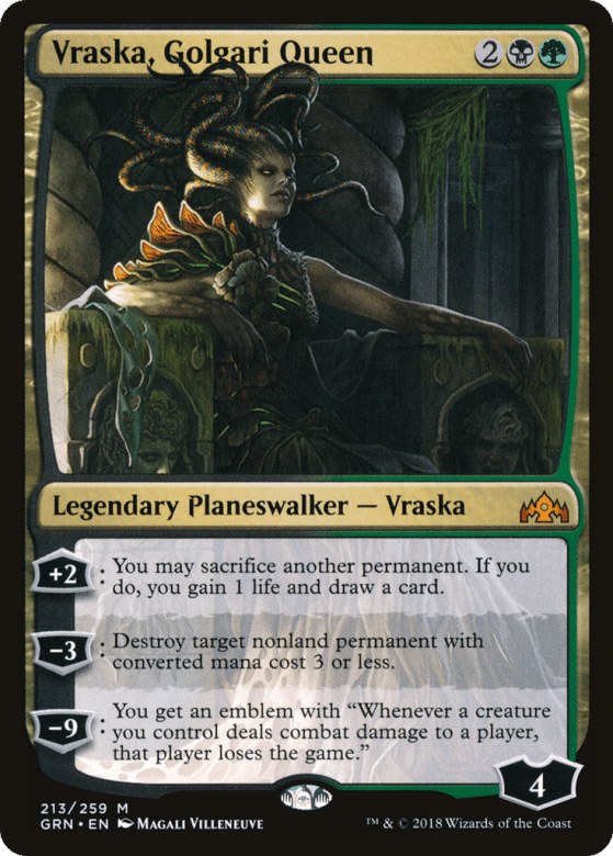 [+2]: You may sacrifice another permanent. If you do, you gain 1 life and draw a card. [−3]: Destroy target nonland permanent with mana value 3 or less. [−9]: You get an emblem with "Whenever a creature you control deals combat damage to a player, that player loses the game."