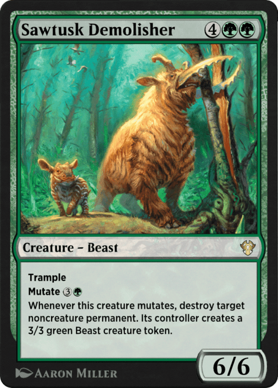 Mutate {3}{G} (If you cast this spell for its mutate cost, put it over or under target non-Human creature you own. They mutate into the creature on top plus all abilities from under it.) Trample Whenever this creature mutates, destroy target noncreature permanent. Its controller creates a 3/3 green Beast creature token.