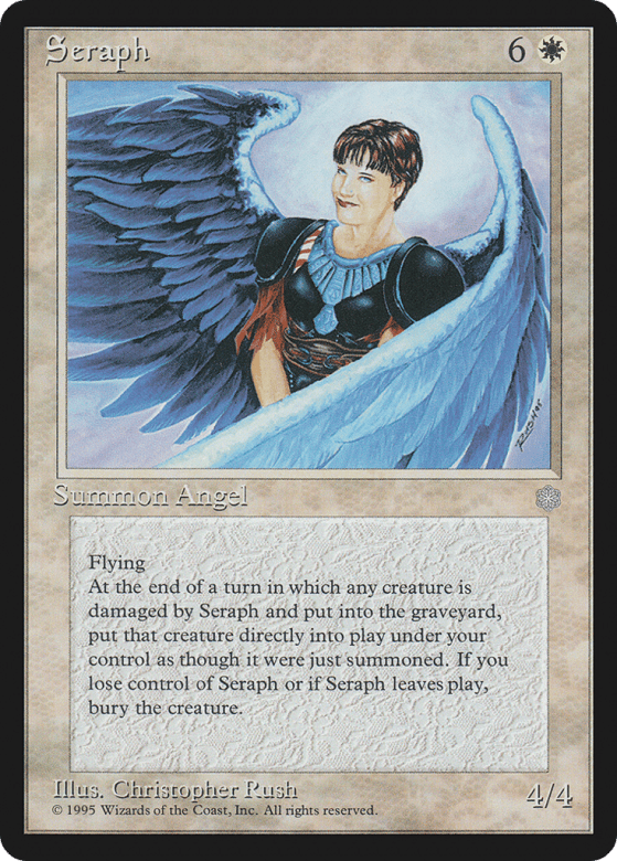 Flying Whenever a creature dealt damage by this creature this turn dies, put that card onto the battlefield under your control at the beginning of the next end step. Sacrifice the creature when you lose control of this creature.