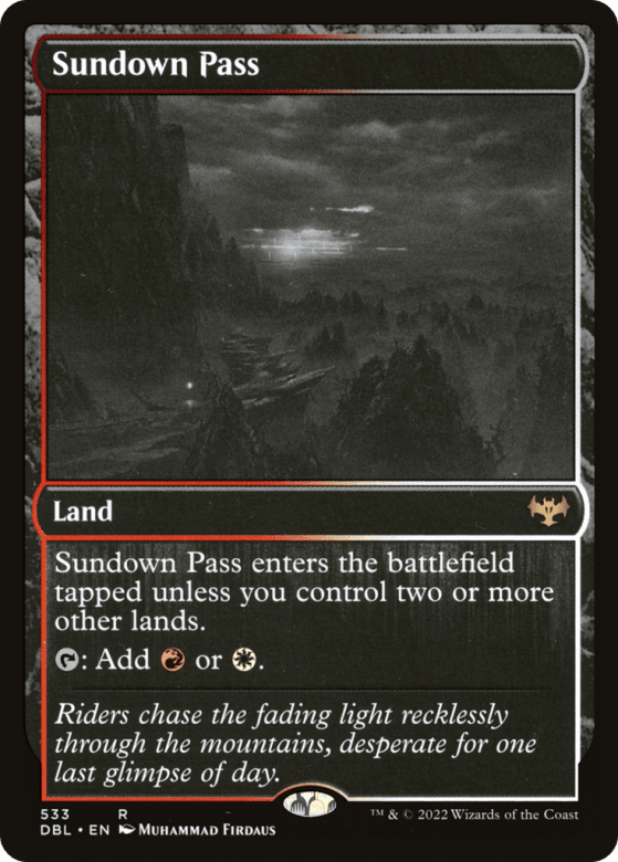 This land enters tapped unless you control two or more other lands. {T}: Add {R} or {W}.