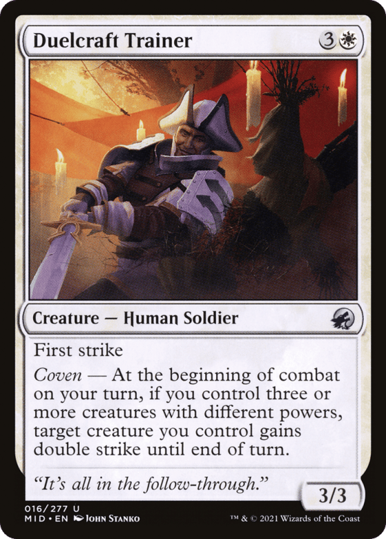 First strike Coven — At the beginning of combat on your turn, if you control three or more creatures with different powers, target creature you control gains double strike until end of turn.