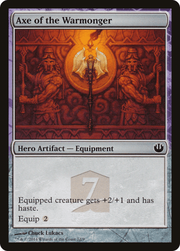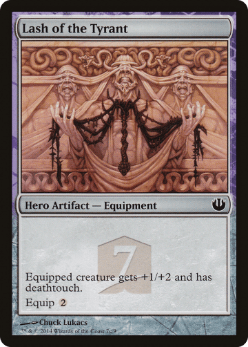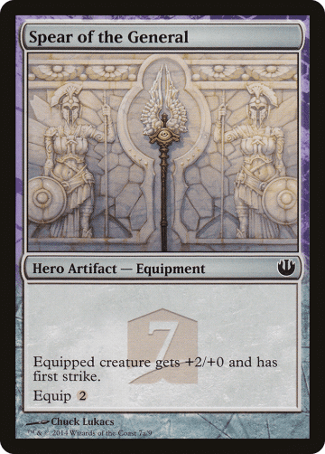 Equipped creature has vigilance and can block an additional creature each combat. Whenever equipped creature deals damage, put a +1/+1 counter on it. Whenever equipped creature deals damage, scry 1. Equipped creature has protection from enchantments. Equipped creature has double strike. Whenever equipped creature deals damage, put a 1/1 white Soldier creature token onto the battlefield. Whenever equipped creature deals damage, untap two target lands.