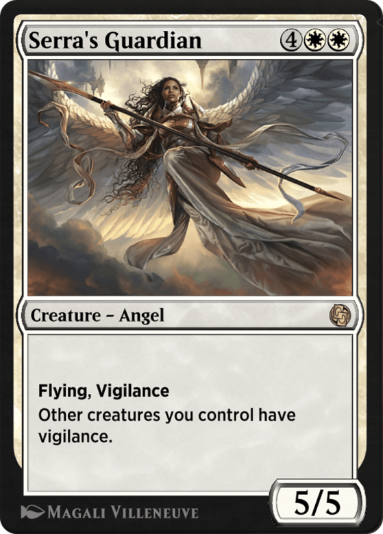 Flying (This creature can't be blocked except by creatures with flying or reach.) Vigilance (Attacking doesn't cause this creature to tap.) Other creatures you control have vigilance.