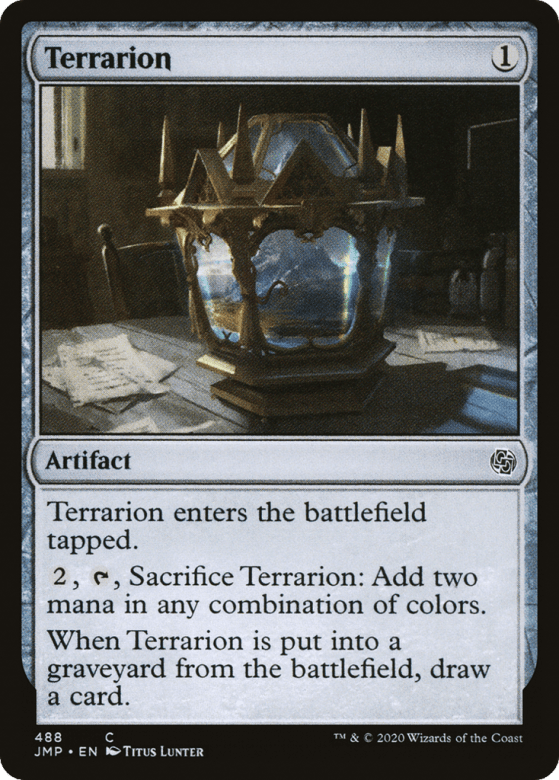 This artifact enters tapped. {2}, {T}, Sacrifice this artifact: Add two mana in any combination of colors. When this artifact is put into a graveyard from the battlefield, draw a card.