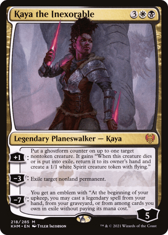 [+1]: Put a ghostform counter on up to one target nontoken creature. It gains "When this creature dies or is put into exile, return it to its owner's hand and create a 1/1 white Spirit creature token with flying." [−3]: Exile target nonland permanent. [−7]: You get an emblem with "At the beginning of your upkeep, you may cast a legendary spell from your hand, from your graveyard, or from among cards you own in exile without paying its mana cost."