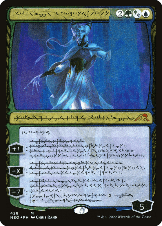 Compleated ({G/U/P} can be paid with {G}, {U}, or 2 life. If life was paid, this planeswalker enters with two fewer loyalty counters.) [+1]: Tap up to one target artifact or creature. It doesn't untap during its controller's next untap step. [−X]: Exile target nonland permanent card with mana value X from your graveyard. Create a token that's a copy of that card. [−7]: Create Tamiyo's Notebook, a legendary colorless artifact token with "Spells you cast cost {2} less to cast" and "{T}: Draw a card."