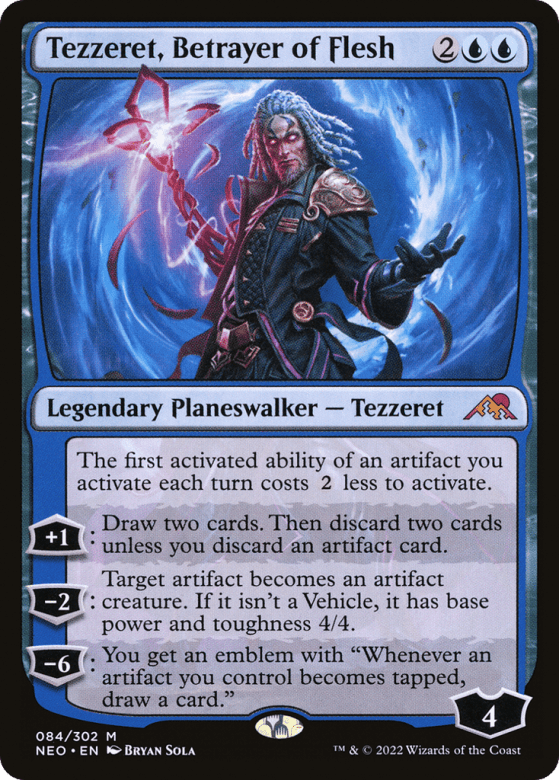 The first activated ability of an artifact you activate each turn costs {2} less to activate. [+1]: Draw two cards. Then discard two cards unless you discard an artifact card. [−2]: Target artifact becomes an artifact creature. If it isn't a Vehicle, it has base power and toughness 4/4. [−6]: You get an emblem with "Whenever an artifact you control becomes tapped, draw a card."