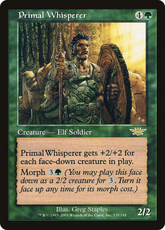 This creature gets +2/+2 for each face-down creature on the battlefield. Morph {3}{G} (You may cast this card face down as a 2/2 creature for {3}. Turn it face up any time for its morph cost.)