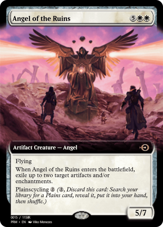 Flying When this creature enters, exile up to two target artifacts and/or enchantments. Plainscycling {2} ({2}, Discard this card: Search your library for a Plains card, reveal it, put it into your hand, then shuffle.)