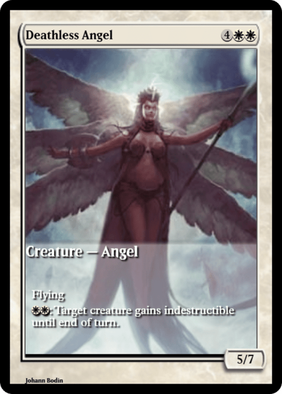 Flying {W}{W}: Target creature gains indestructible until end of turn.