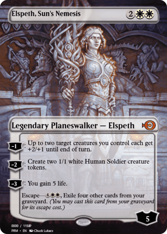 [−1]: Up to two target creatures you control each get +2/+1 until end of turn. [−2]: Create two 1/1 white Human Soldier creature tokens. [−3]: You gain 5 life. Escape—{4}{W}{W}, Exile four other cards from your graveyard. (You may cast this card from your graveyard for its escape cost.)