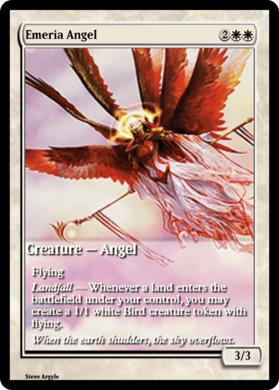 Flying Landfall — Whenever a land you control enters, you may create a 1/1 white Bird creature token with flying.