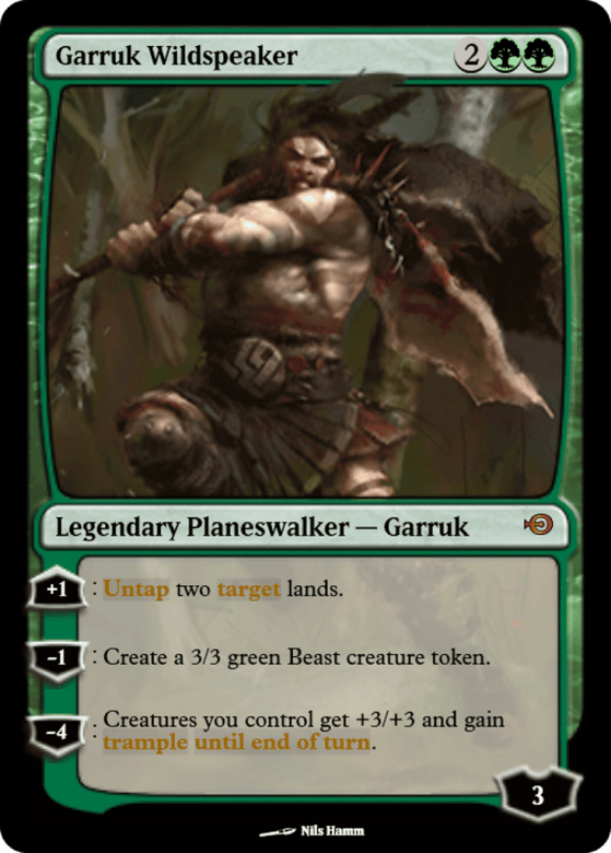 [+1]: Untap two target lands. [−1]: Create a 3/3 green Beast creature token. [−4]: Creatures you control get +3/+3 and gain trample until end of turn.