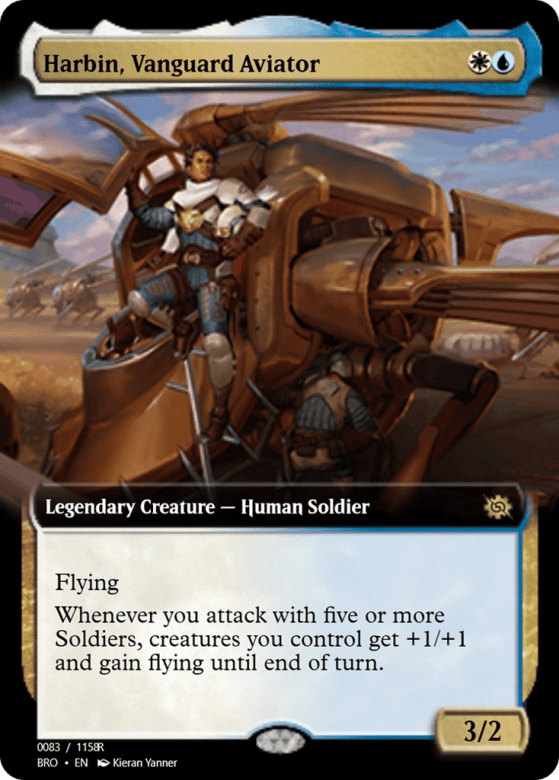 Flying Whenever you attack with five or more Soldiers, creatures you control get +1/+1 and gain flying until end of turn.