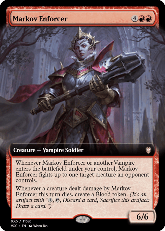 Whenever this creature or another Vampire you control enters, this creature fights up to one target creature an opponent controls. Whenever a creature dealt damage by this creature this turn dies, create a Blood token. (It's an artifact with "{1}, {T}, Discard a card, Sacrifice this token: Draw a card.")