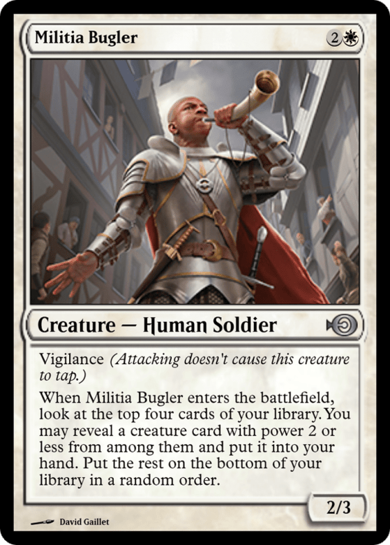 Vigilance (Attacking doesn't cause this creature to tap.) When this creature enters, look at the top four cards of your library. You may reveal a creature card with power 2 or less from among them and put it into your hand. Put the rest on the bottom of your library in a random order.