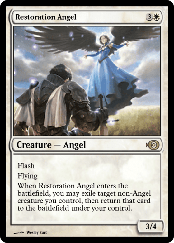 Flash Flying When this creature enters, you may exile target non-Angel creature you control, then return that card to the battlefield under your control.