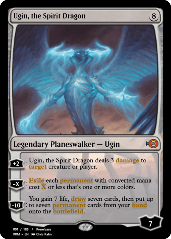 [+2]: Ugin deals 3 damage to any target. [−X]: Exile each permanent with mana value X or less that's one or more colors. [−10]: You gain 7 life, draw seven cards, then put up to seven permanent cards from your hand onto the battlefield.