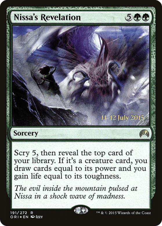 Scry 5, then reveal the top card of your library. If it's a creature card, you draw cards equal to its power and you gain life equal to its toughness.