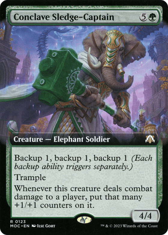 Backup 1, backup 1, backup 1 (When this creature enters, put a +1/+1 counter on target creature. If that's another creature, it gains the following abilities until end of turn. Each backup ability triggers separately.) Trample Whenever this creature deals combat damage to a player, put that many +1/+1 counters on it.