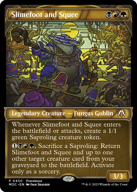 Whenever Slimefoot and Squee enters or attacks, create a 1/1 green Saproling creature token. {1}{B}{R}{G}, Sacrifice a Saproling: Return this card and up to one other target creature card from your graveyard to the battlefield. Activate only as a sorcery.