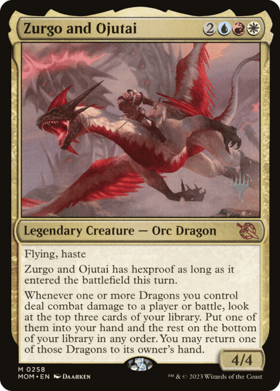 Flying, haste Zurgo and Ojutai has hexproof as long as it entered this turn. Whenever one or more Dragons you control deal combat damage to a player or battle, look at the top three cards of your library. Put one of them into your hand and the rest on the bottom of your library in any order. You may return one of those Dragons to its owner's hand.