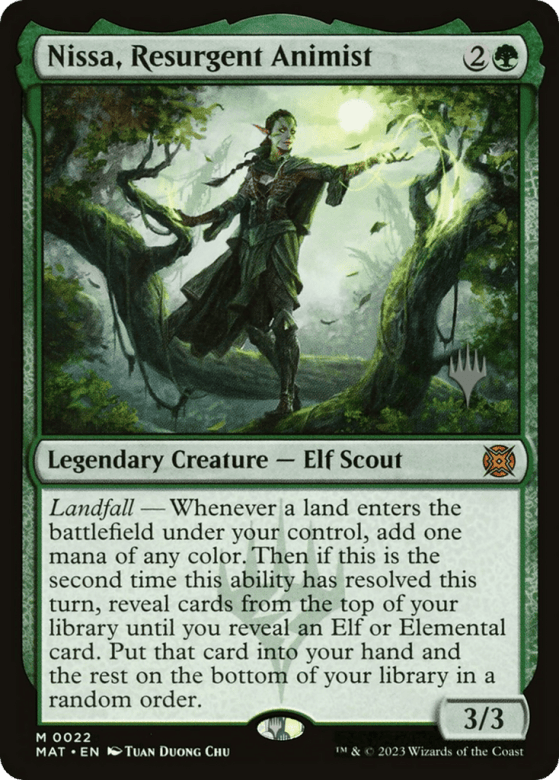 Landfall — Whenever a land you control enters, add one mana of any color. Then if this is the second time this ability has resolved this turn, reveal cards from the top of your library until you reveal an Elf or Elemental card. Put that card into your hand and the rest on the bottom of your library in a random order.