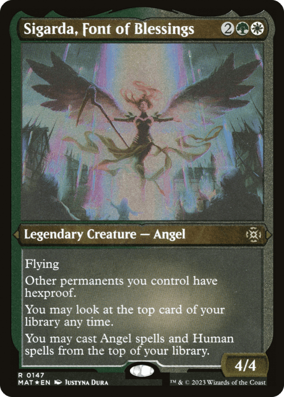Flying Other permanents you control have hexproof. You may look at the top card of your library any time. You may cast Angel spells and Human spells from the top of your library.