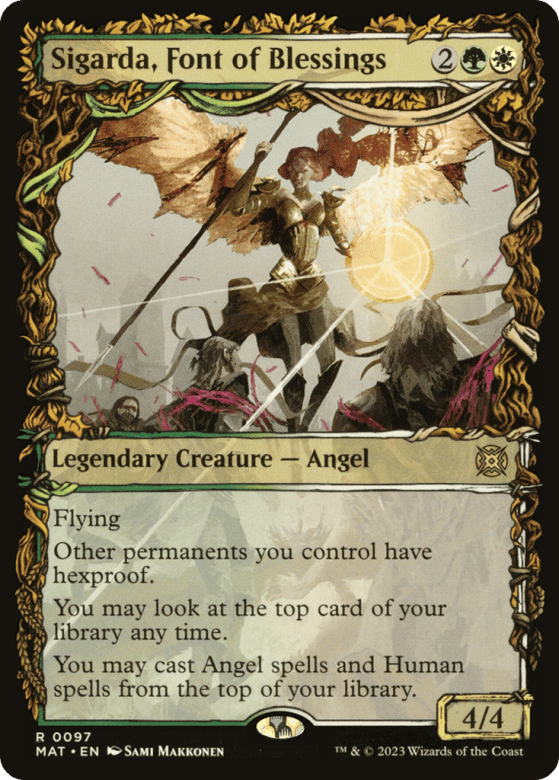 Flying Other permanents you control have hexproof. You may look at the top card of your library any time. You may cast Angel spells and Human spells from the top of your library.
