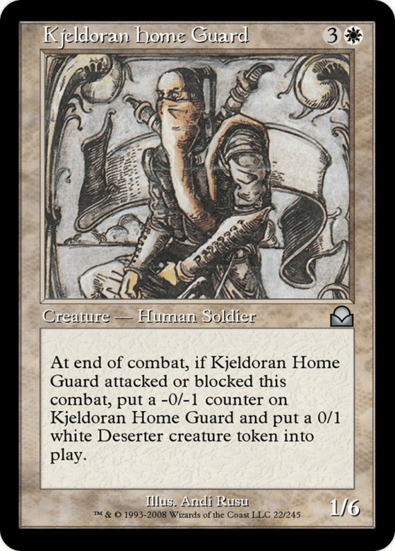 At end of combat, if this creature attacked or blocked this combat, put a -0/-1 counter on this creature and create a 0/1 white Deserter creature token.