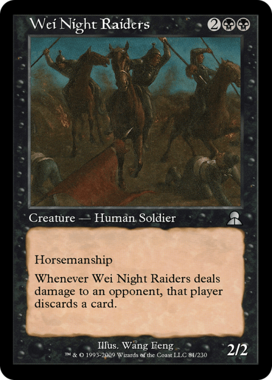 Horsemanship (This creature can't be blocked except by creatures with horsemanship.) Whenever this creature deals damage to an opponent, that player discards a card.