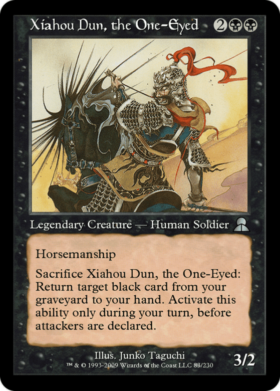 Horsemanship (This creature can't be blocked except by creatures with horsemanship.) Sacrifice Xiahou Dun: Return target black card from your graveyard to your hand. Activate only during your turn, before attackers are declared.