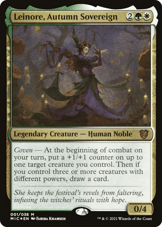 Coven — At the beginning of combat on your turn, put a +1/+1 counter on up to one target creature you control. Then if you control three or more creatures with different powers, draw a card.