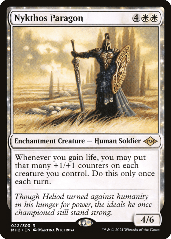 Whenever you gain life, you may put that many +1/+1 counters on each creature you control. Do this only once each turn.